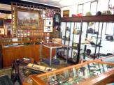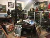 On cluttered display tables sat a